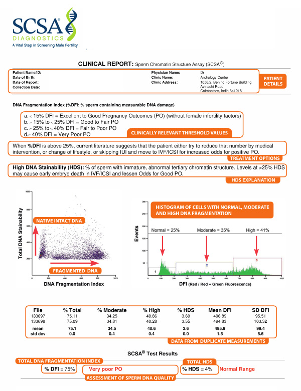 The SCSA test measures the DNA Fragmentation Index (DFI) of your sperm.