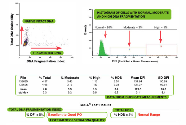 The SCSA test determines the stability of sperm DNA using the DFI (DNA Fragmentation Index)